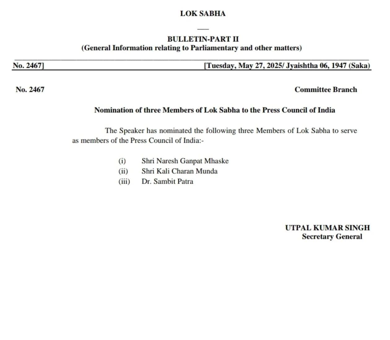 लोकसभा अध्यक्ष ओम बिरला ने मंगलवार देर रात प्रेस कौन्सिल ऑफ इंडिया के तीन सदस्यों के नामों का एलान किया ।सांसद नरेश म्हस्के के साथ कालीचरण मुंडा और संबित पात्रा को भी नियुक्त किया गया है।